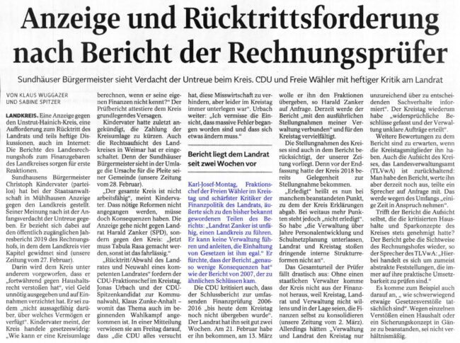 Thüringer Landeszeitung vom 09.03.2019 Die Haushalts- und Wirtschaftsführung des Unstrut-Hainich-Kreises wurde durch den Thüringer Rechnungshof geprüft. Das Fazit der Prüfung der Haushaltsjahre 2006 bis 2016 zeichnet ein miserables Bild.